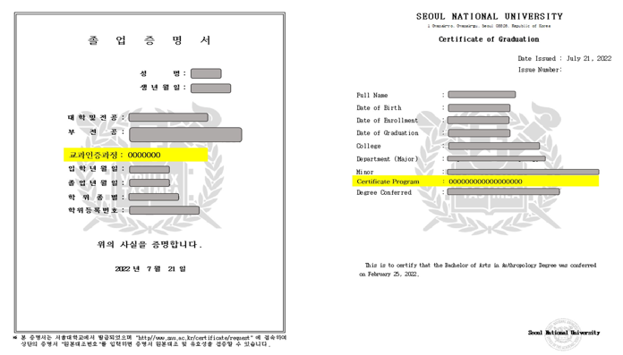 각 교과인증과정의 이수조건을 만족하면 졸업증명서(학위수여증명서), 성적증명서에 교과인증과정이 기재됩니다.