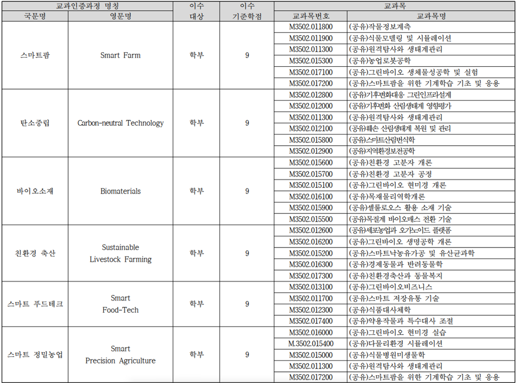 | 교과인증과정 – 각 단과대학 및 학과(부)의 공통교육과정 이수규정에서 정한 공통교육 과정 교과목(36학점 이상) 간 | – 교과인증과정 이수기준 학점 12학점 이상 & 학부대학 주관 인증과정만 가능 – 학부대학 외 주관 인증과정 불가 |